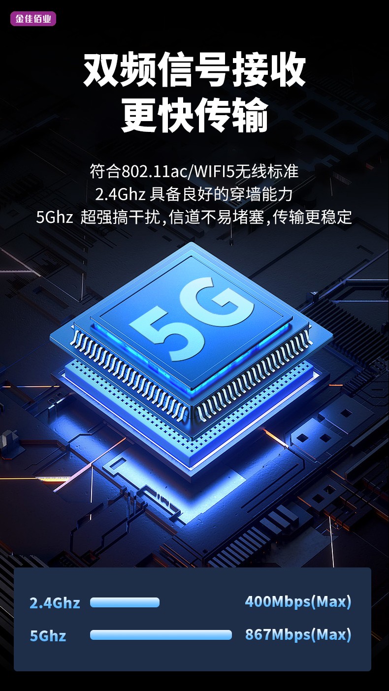 傳輸速率:2.4G:400Mpbs 5G:867Mpbs