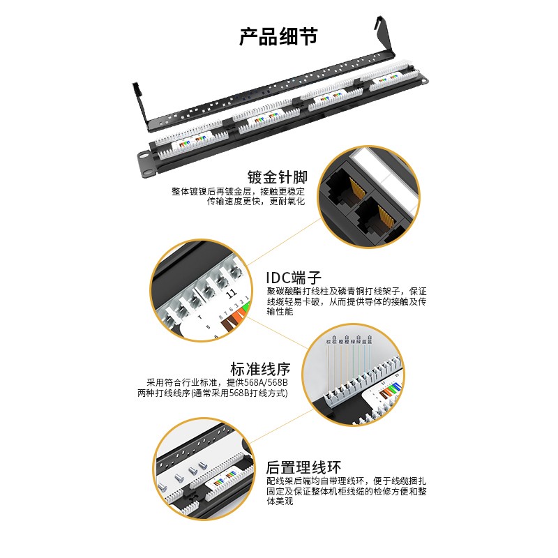 標(biāo)準(zhǔn)線序,所有插座都具備T568A和T568B兩種線序,適用所有19英寸標(biāo)準(zhǔn)機(jī)柜,后置理線環(huán)