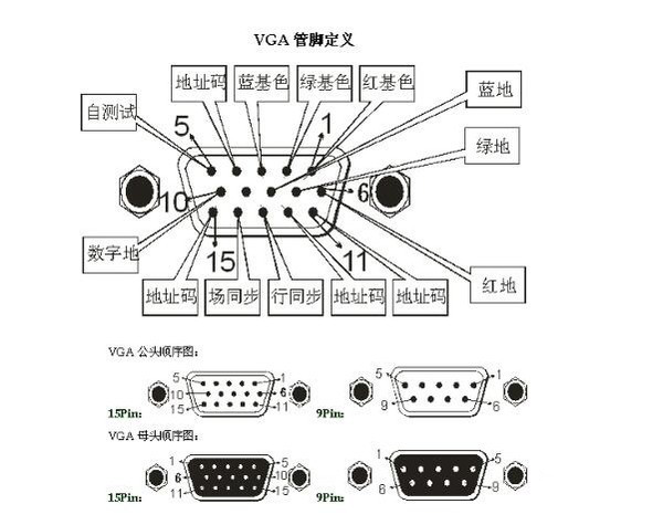 VGA線有不同的針腳,比如15針腳和9針腳,相信很多朋友都會比較好奇這些針腳到底都負責(zé)哪些事宜?下面金佳佰業(yè)用一張圖來給大家解答。
